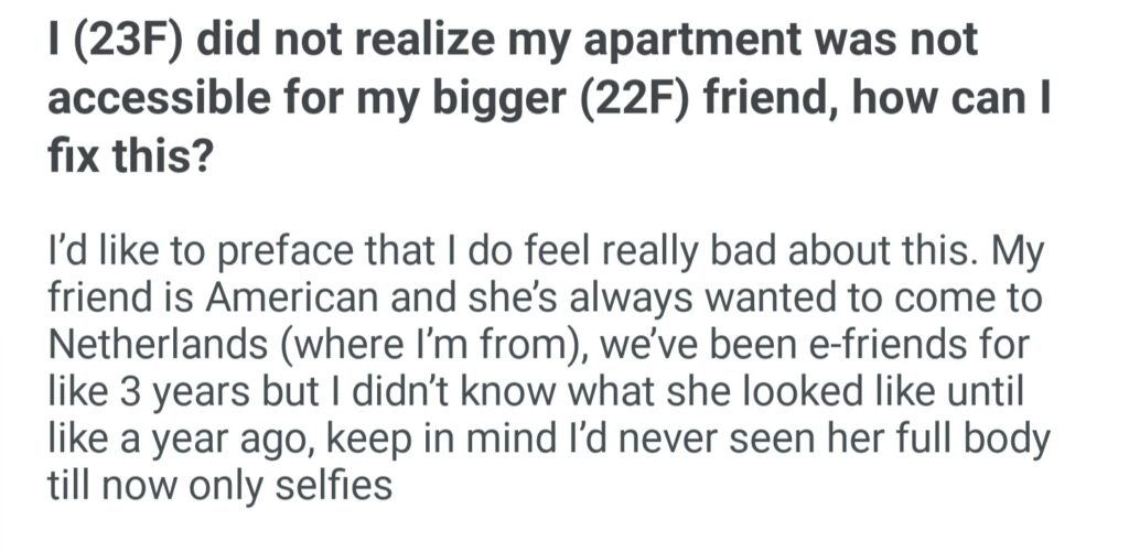 1 23f Did Not Realize My Apartment Was Not Accessible For My Bigger 22f Friend How Can I Fix This