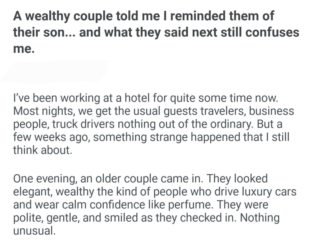 A Wealthy Couple Told Me I Reminded Them Of Their Son And What They Said Next Still Confuses Me