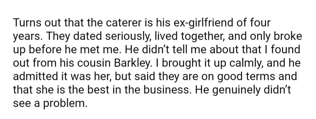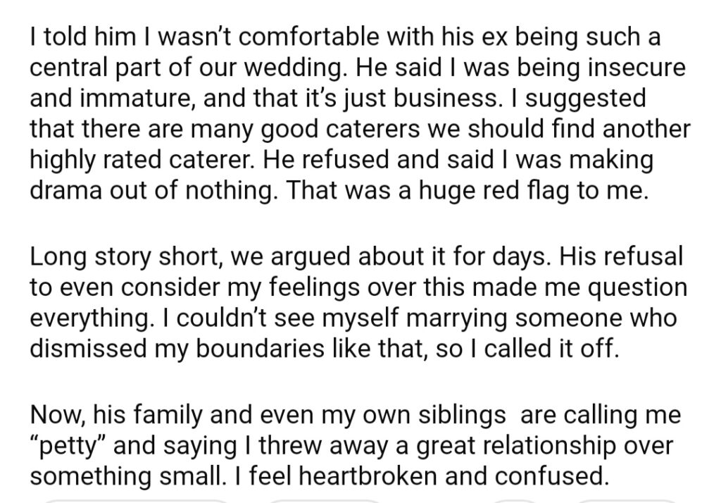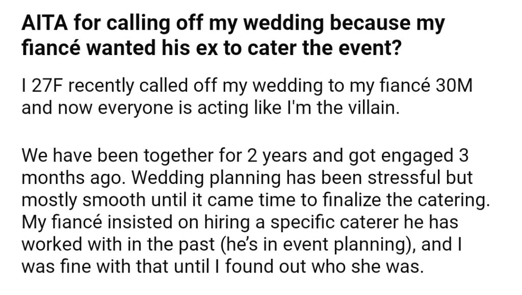 AITA For Calling My Wedding Because My Fiance Wanted His Ex To Cater The Event