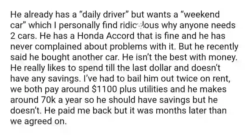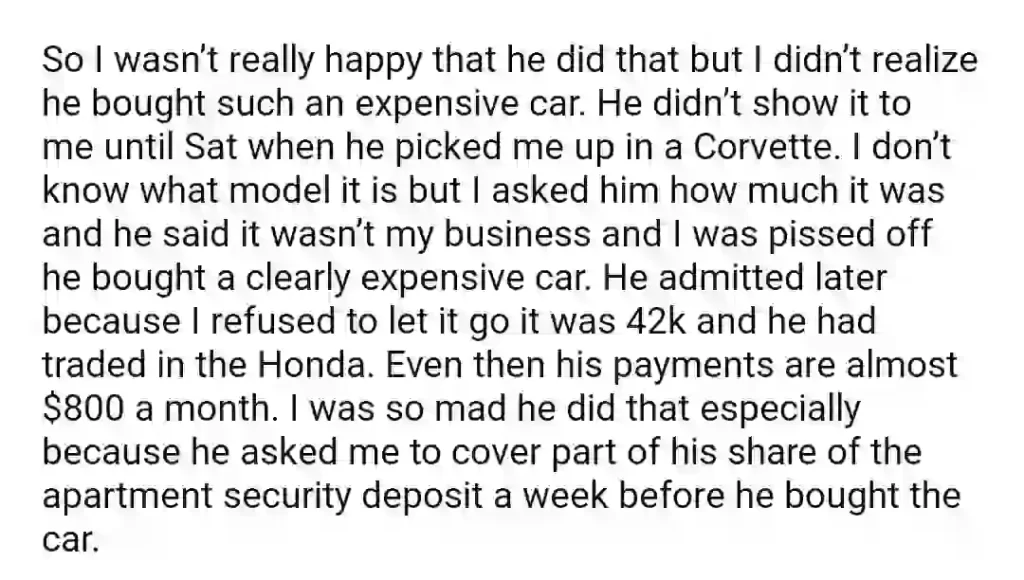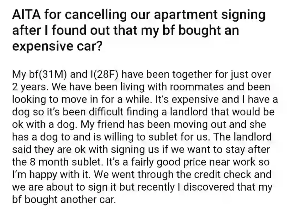 AITA For Cancelling Our Apartment Signing After I Found Out That My BF Bought An Expensive Car