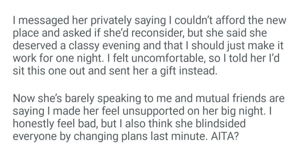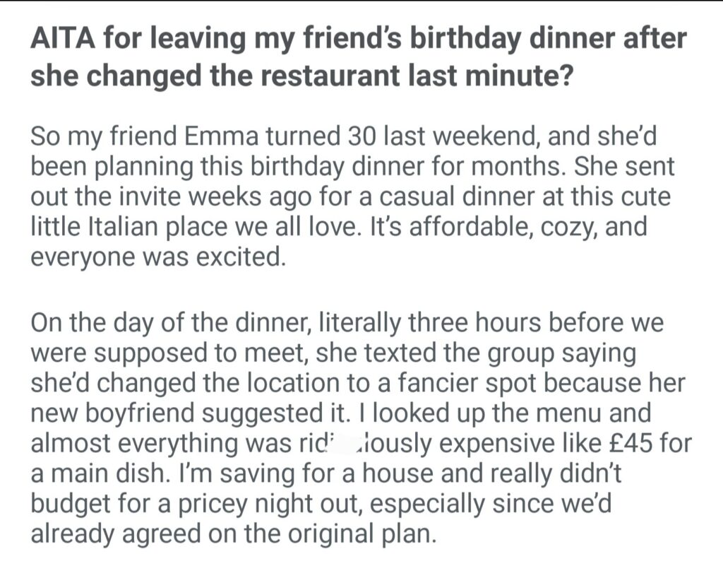 AITA For Leaving My Friends Birthday Dinner After She Changed The Restaurant Last Minute