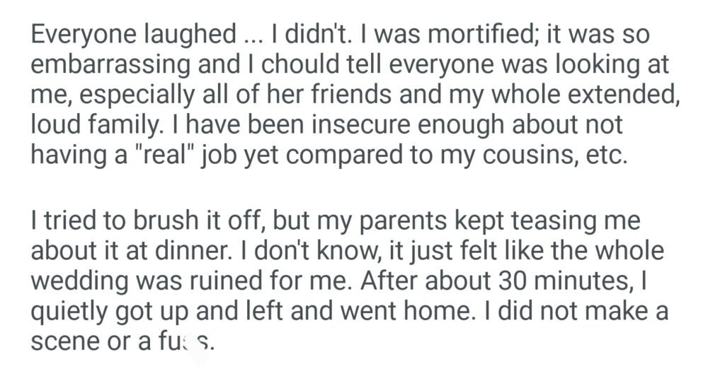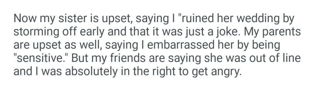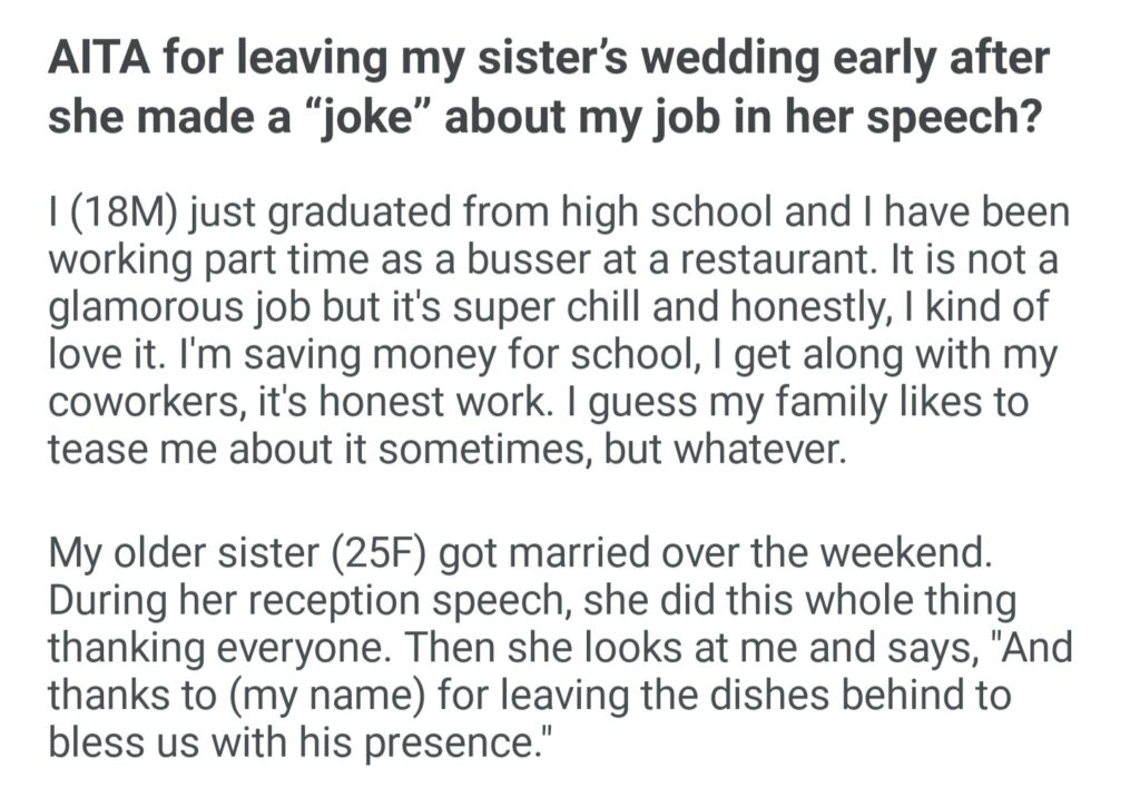 AITA For Leaving My Sister’s Wedding Early After She Made A Joke About My Job