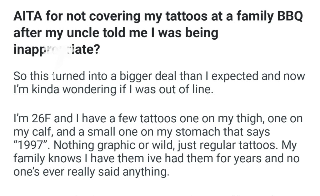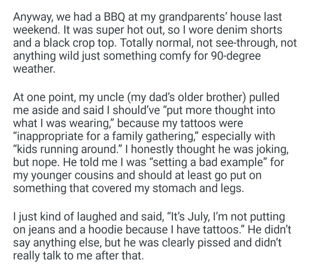 AITA For Not Covering My Tattoos At A Family BBQ After My Uncle Told Me I Was Being