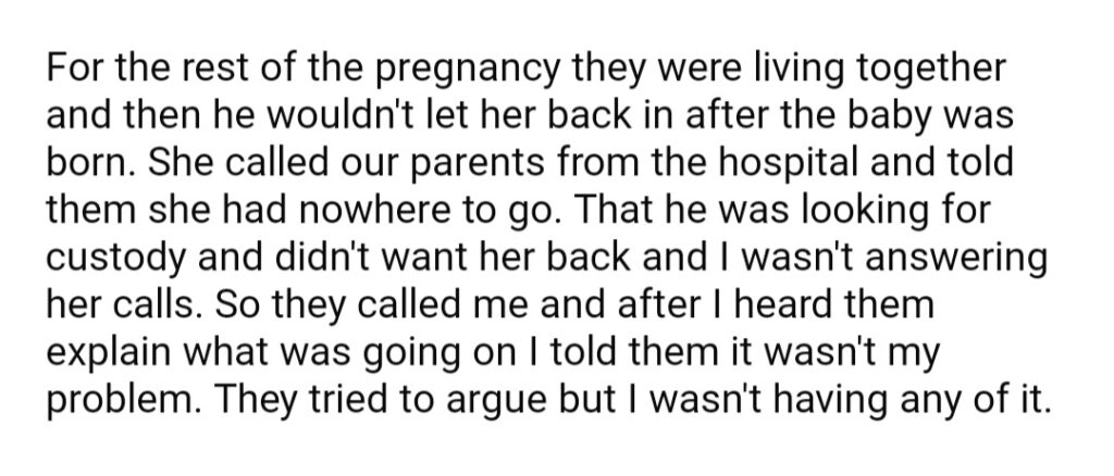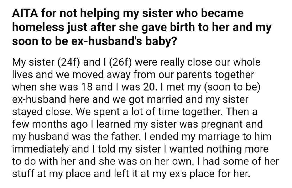 AITA For Not Helping My Sister Who Become Just After She Gave Birth To Her And Soon To Be Ex Husband’s Baby