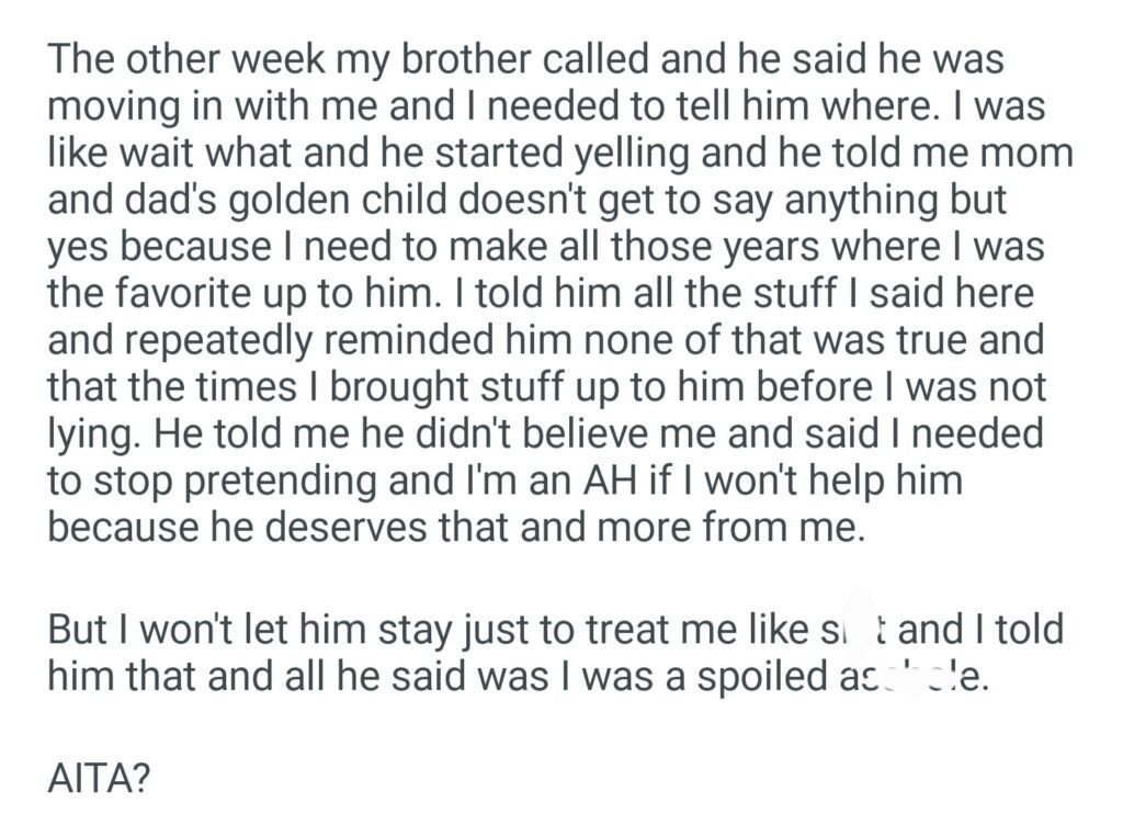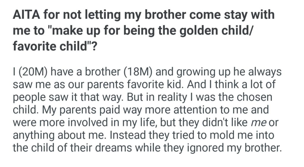 AITA For Not Letting My Brother Come Stay With Me To Make Up For Being A Golden Child