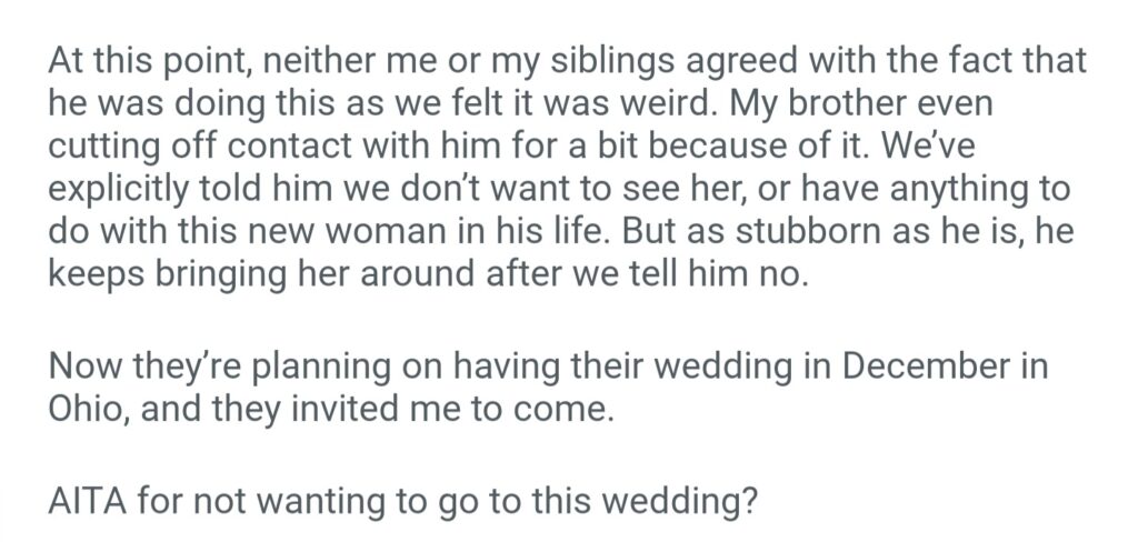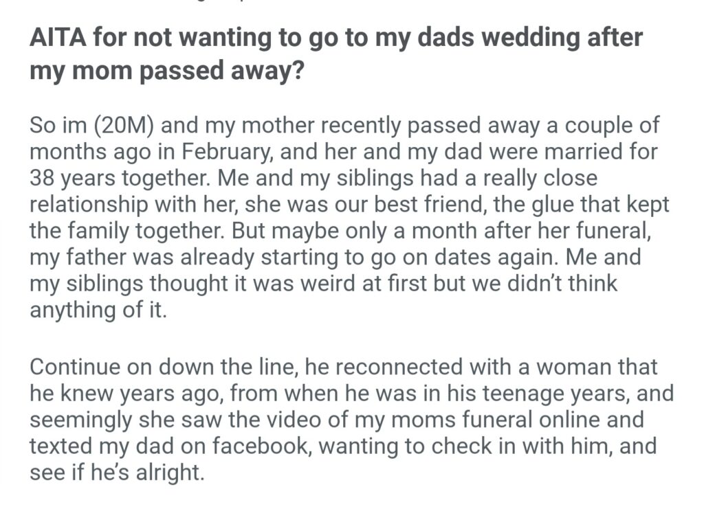 AiTA For Not Wanting To Go To My Dads Wedding After My Mom Passed Away