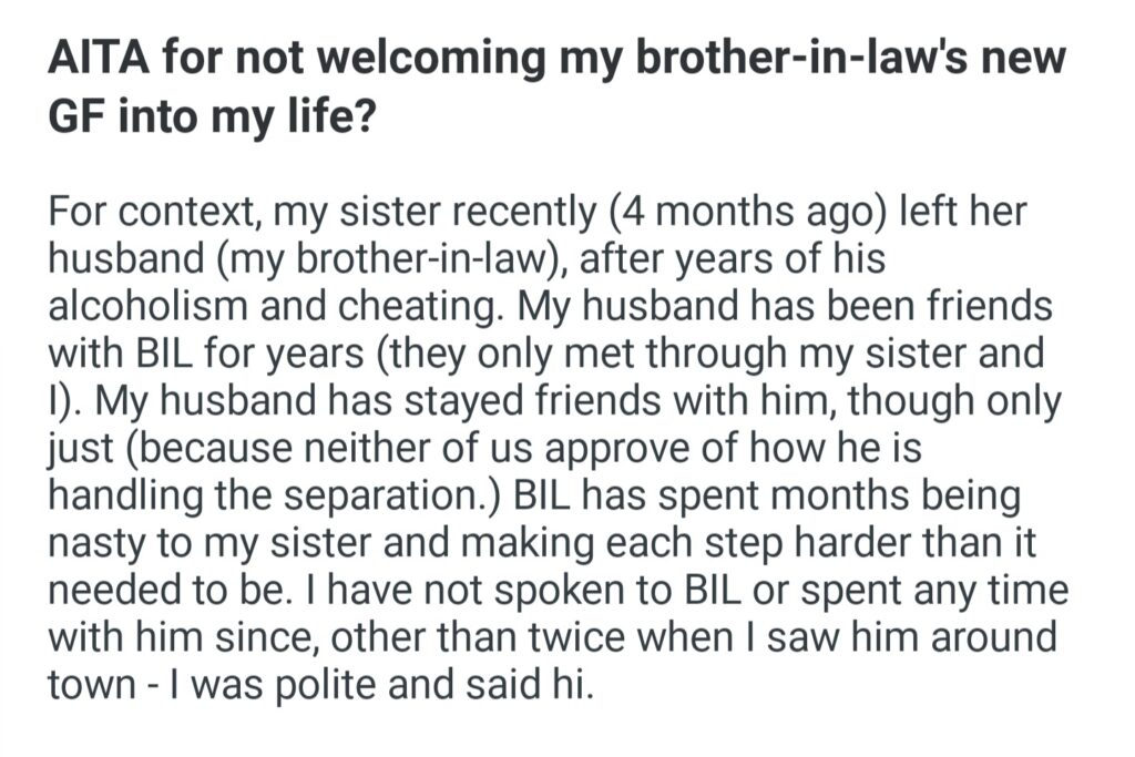 AITA For Not Welcoming My Brother In Law’s New GF Into My Life