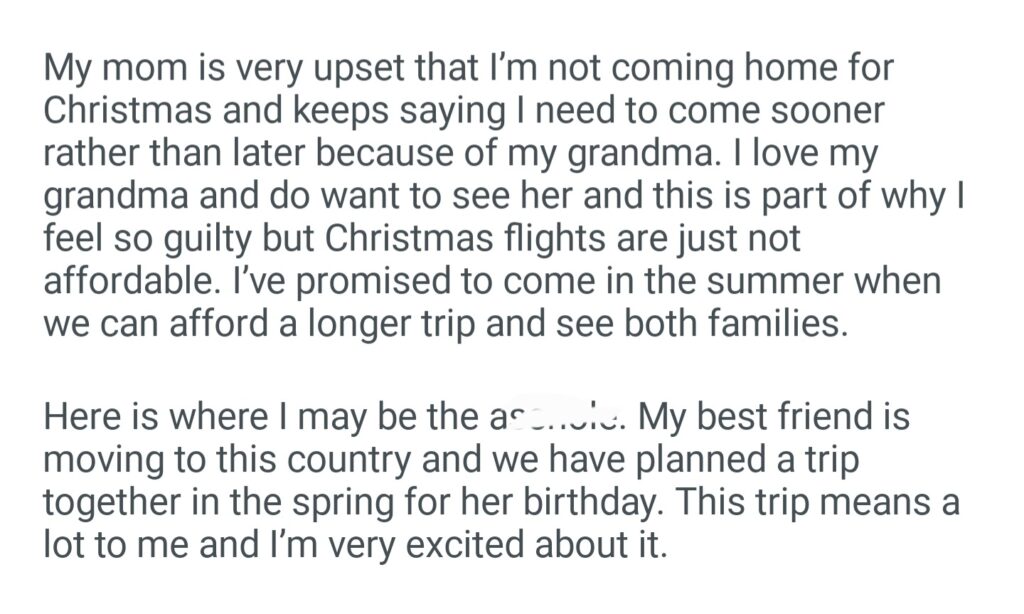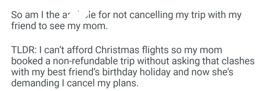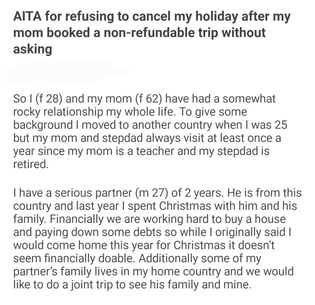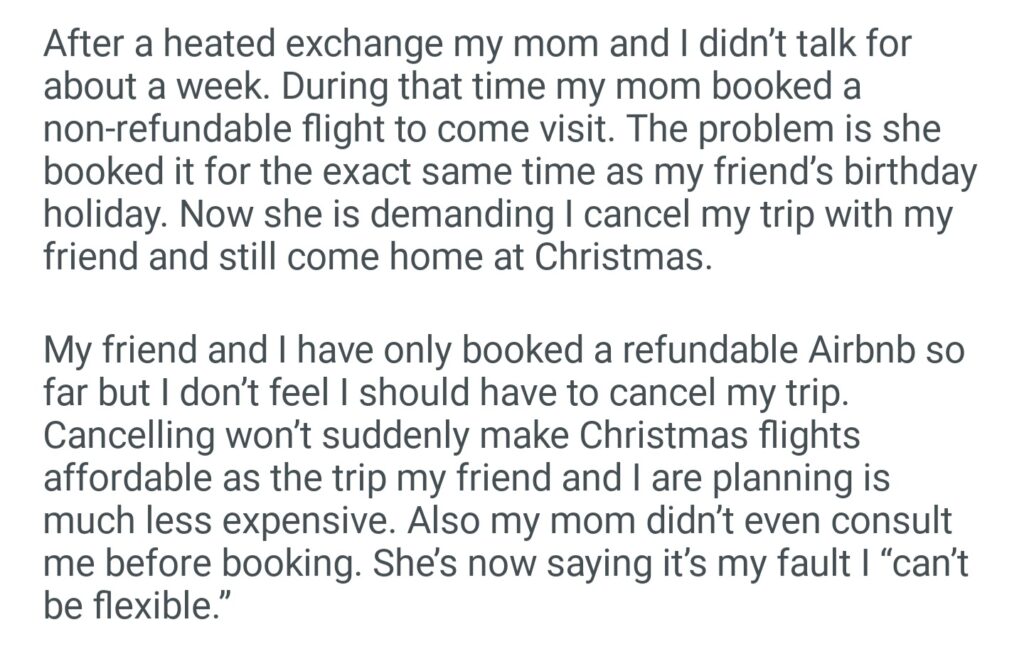 AITA For Refusing To Cancel My Holiday After My Mom Booked A Non Refundable Trip Without Asking