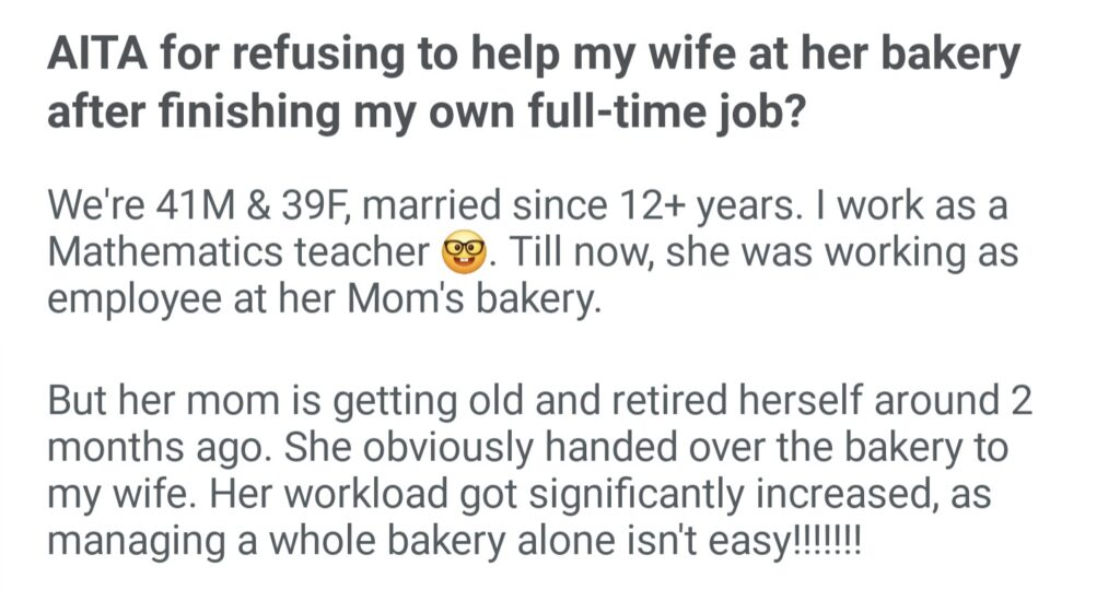 AITA For Refusing To Help My Wife At Her Bakery After Finishing My Own Full Time Job
