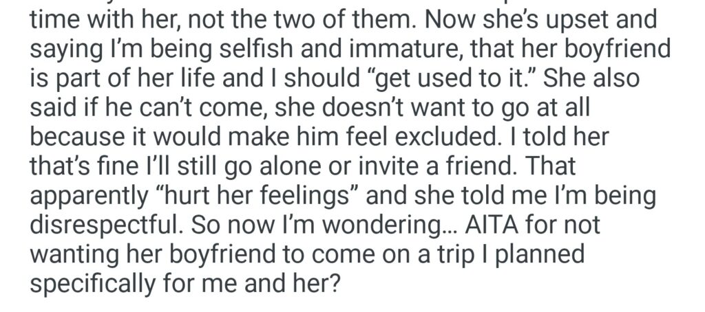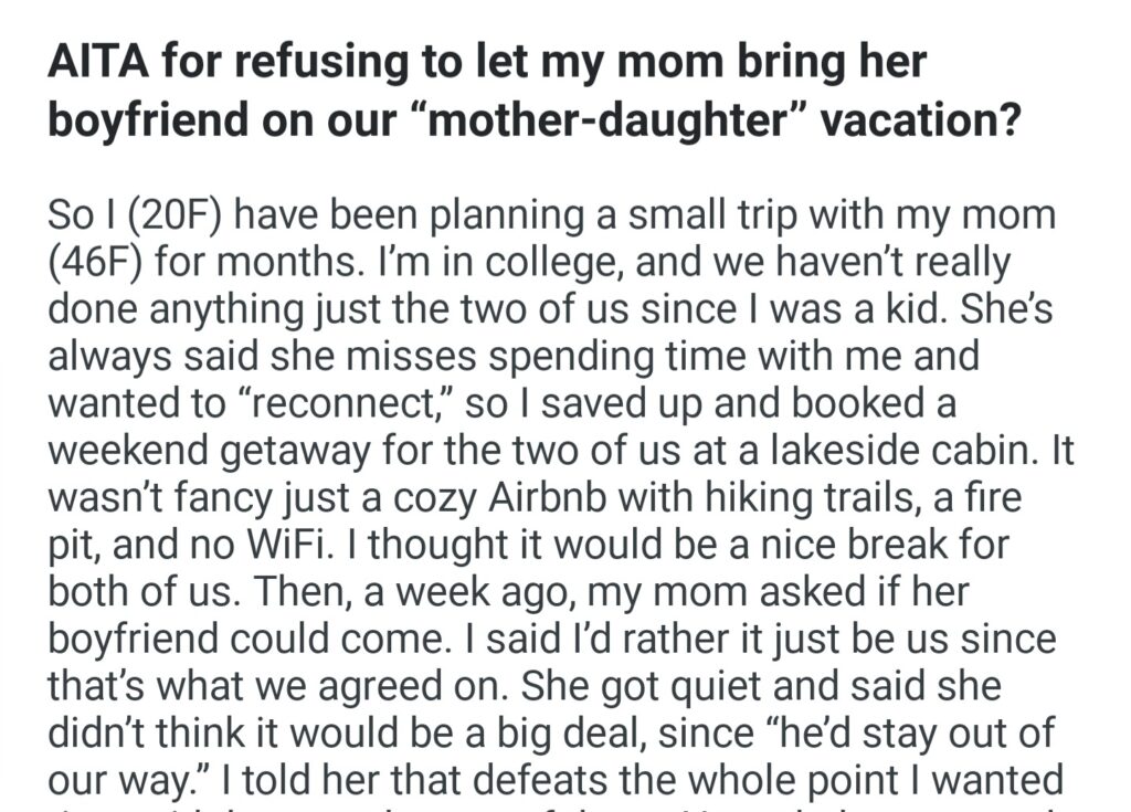 AITA For Refusing To Let My Mom Bring Her Boyfriend On Our Mother Daughter Vaction