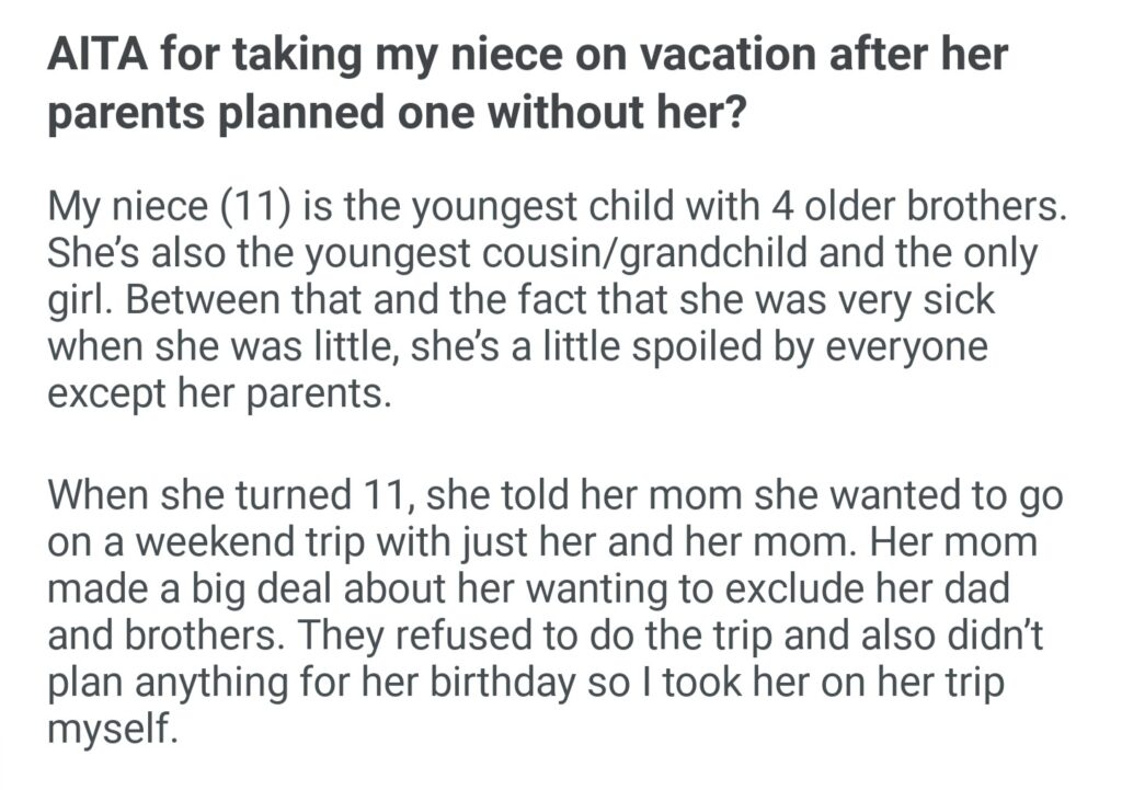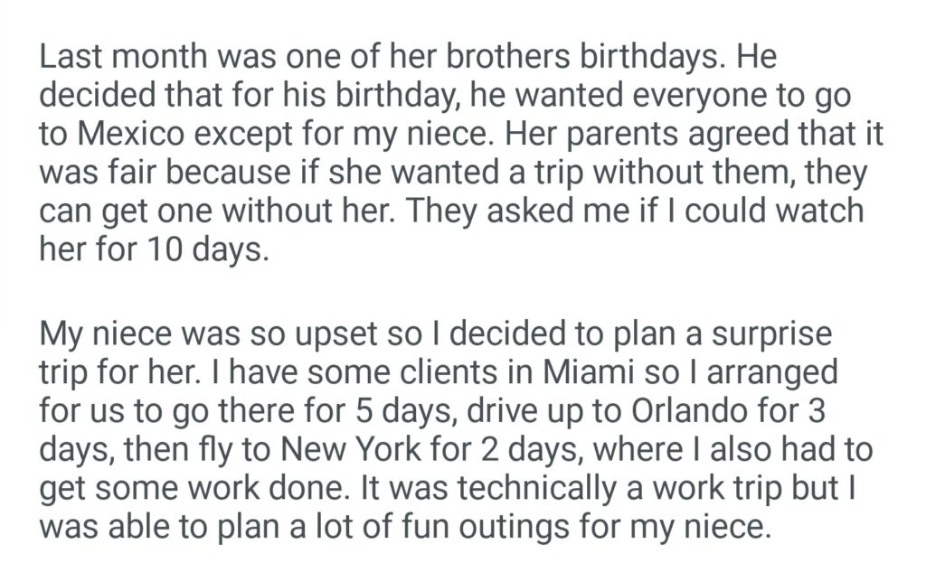 AITA For Taking My Niece On Vacation After Her Parents Planned One Without Her