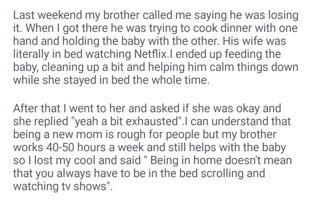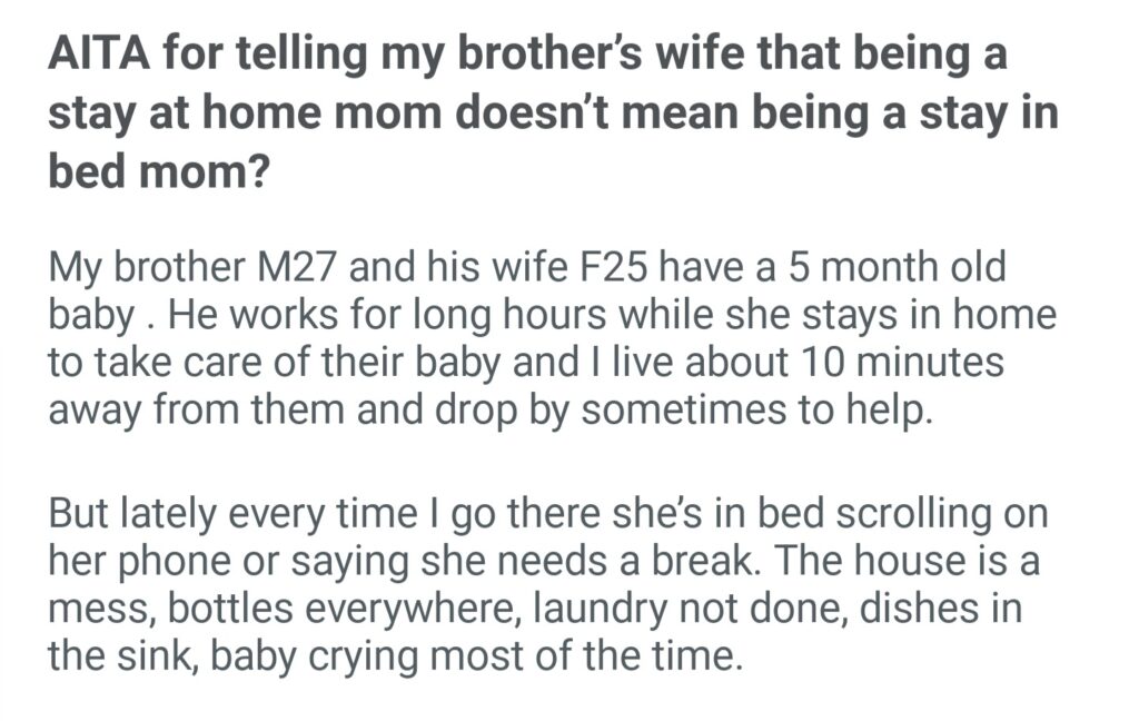 AITA For Telling My Brother’s Wife That Being A Stay At Home Mom Doesn’t Mean Being A Stay In Bed Mom