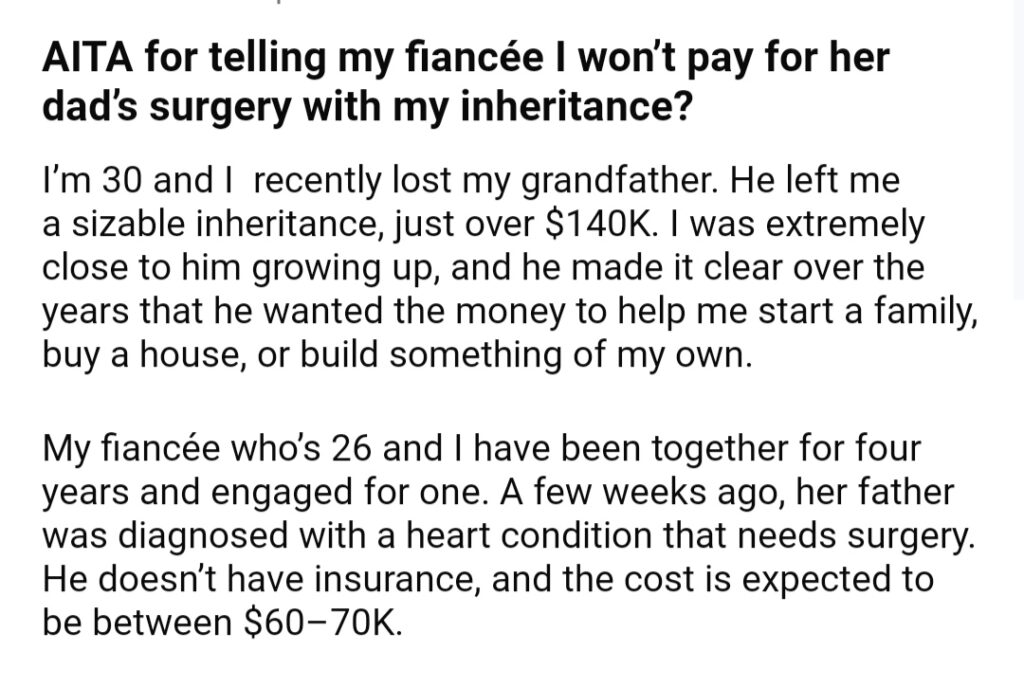 AITA For Telling My Fiancee I Won’t Pay For Her Dad’s Surgery With My Inheritance