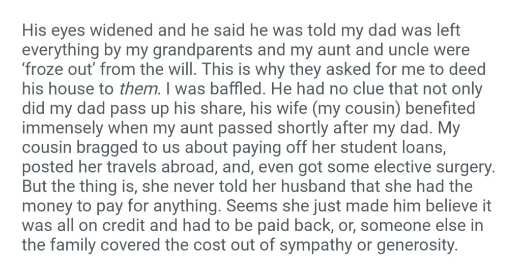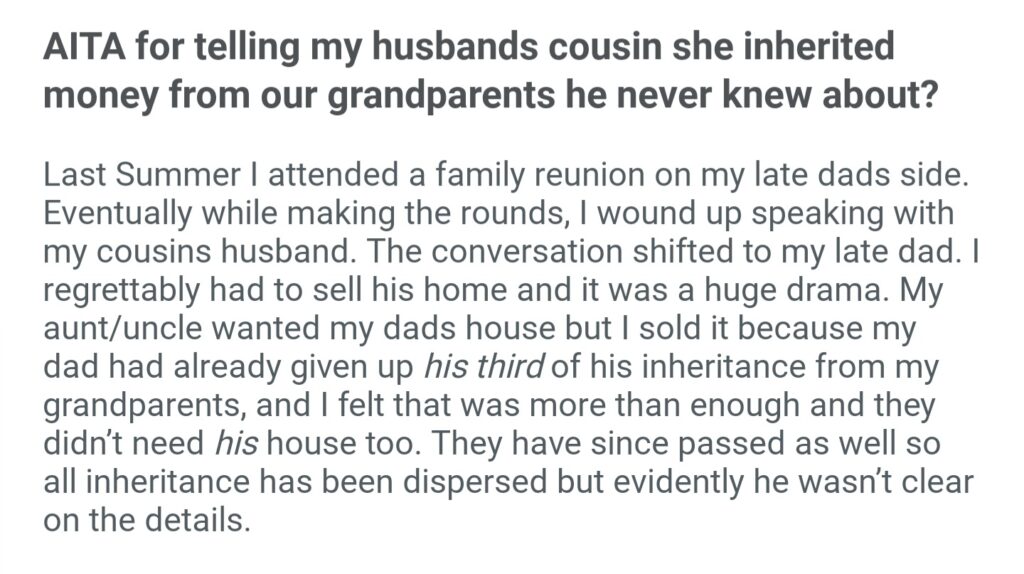 AITA For Telling My Husband Cousin She Inherited Money From Our Grandparents He Never Knew About It
