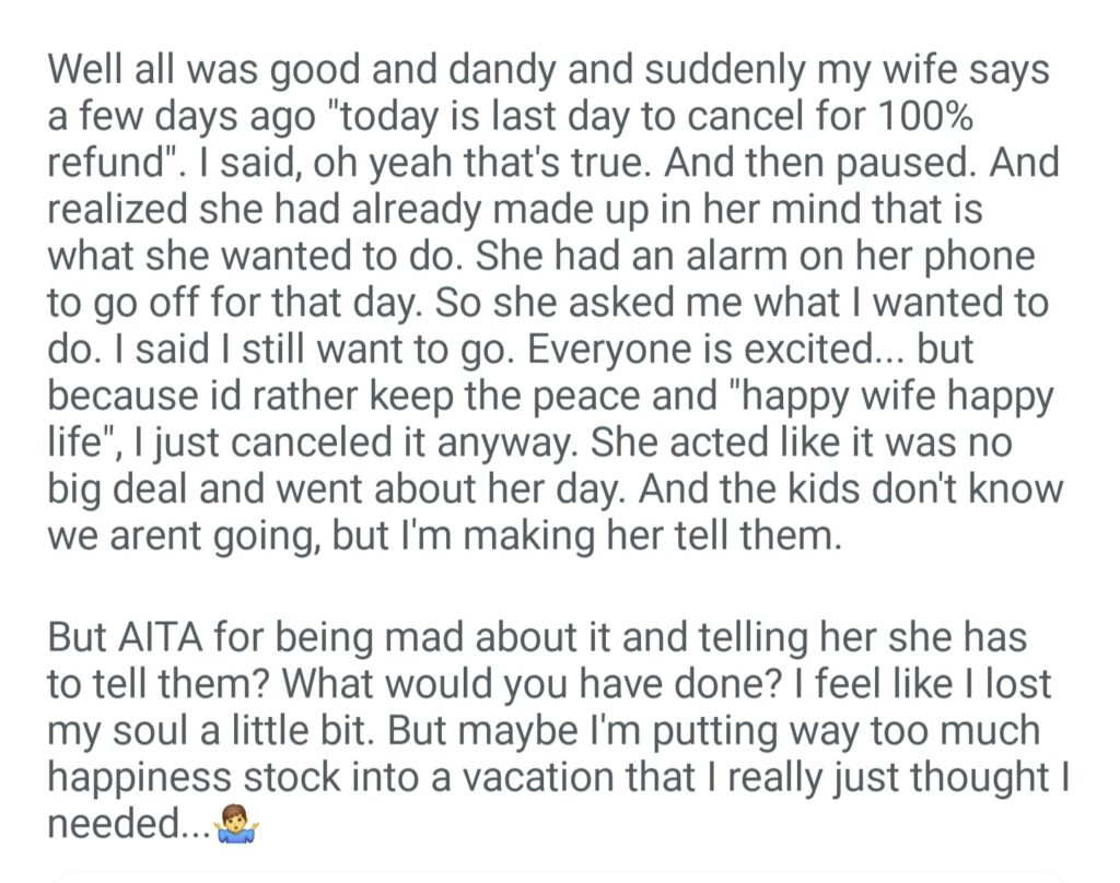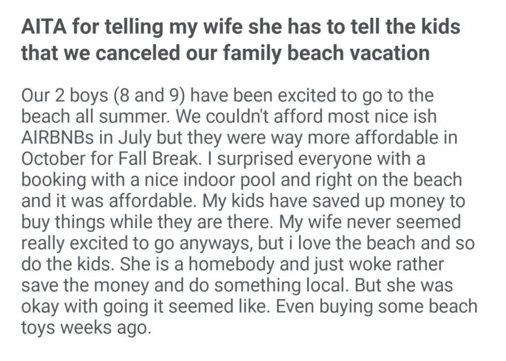 AITA For Telling My Wife She Has To Tell The Kids That We Canceled Our Family Beach Vacation