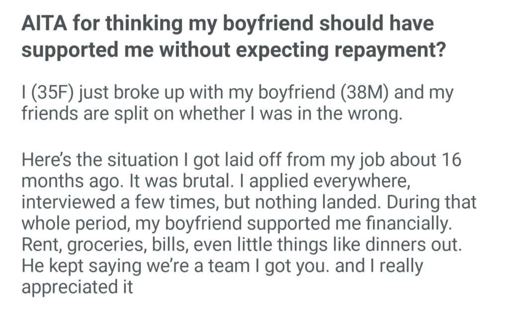 AITA For Thinking My Boyfriend Should Have Supported Me Without Expecting Repayment