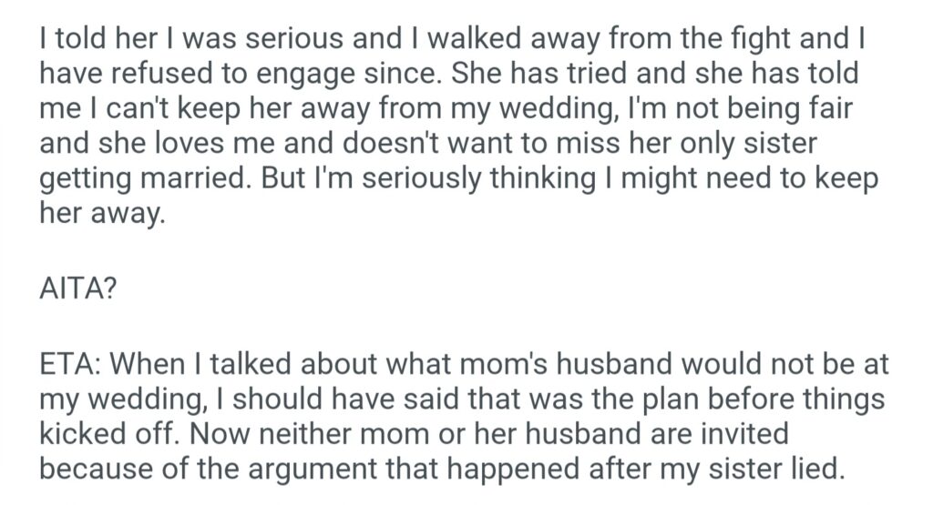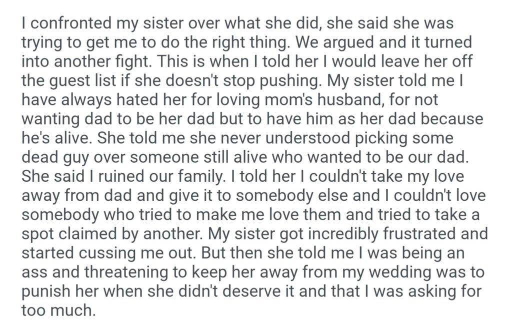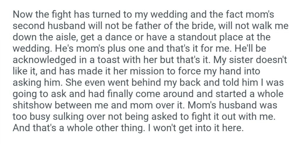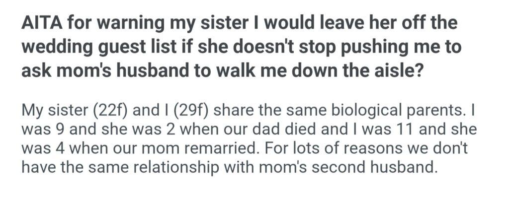 AITA For Wanting My Sister I Would Leave Her Off The Wedding Guest List She Doesn’t Stop Pushing Me To Ask Mom’s Husband To Walk Me Down The Aisle