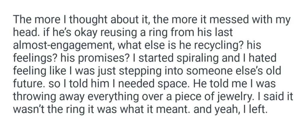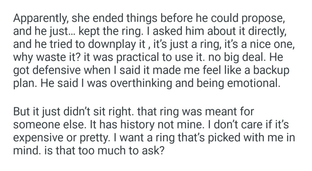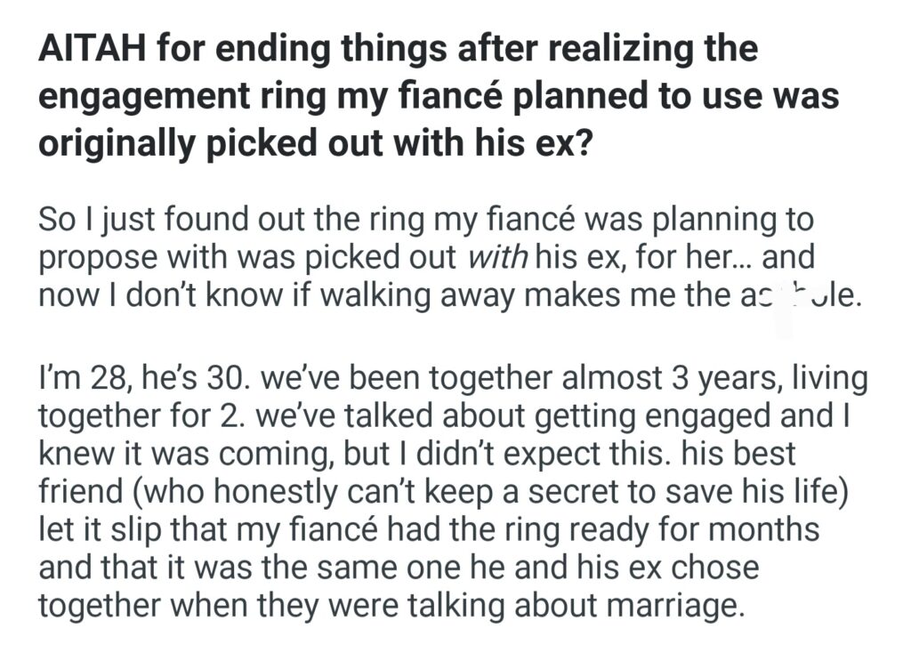 AITAH For Ending Things After Realizing The Engagment Ring My Fiance Planned To Use Was Originally Picked Out With His Ex