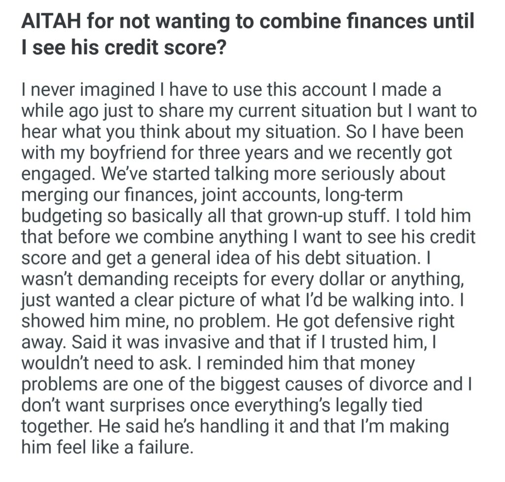 AITAH For Not Wanting To Combine Finances Untill I See His Credit Score