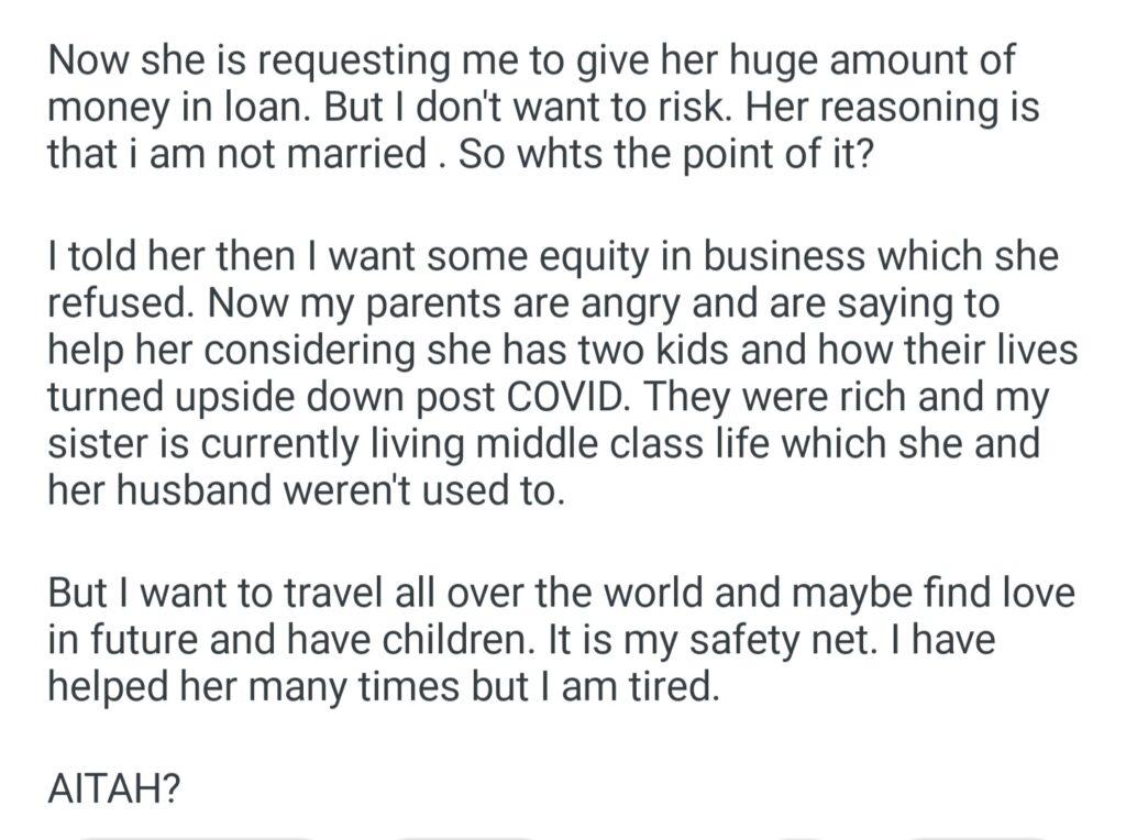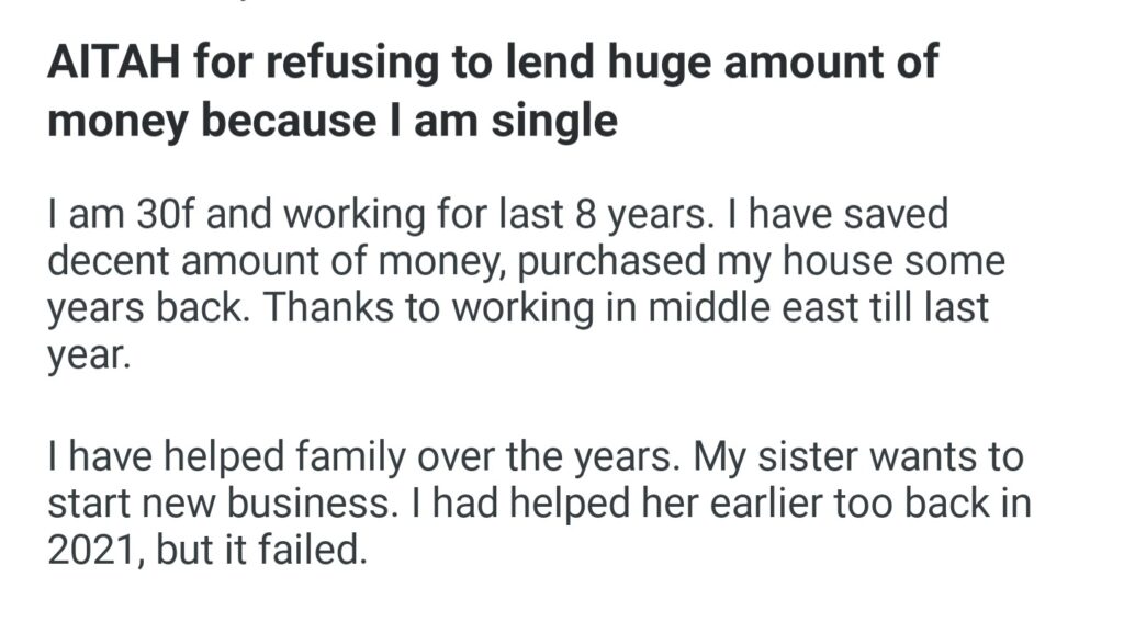 AITAH For Refusing To Lend Huge Amount Of Money Because I Am Single