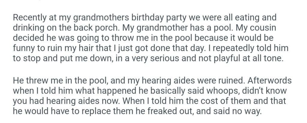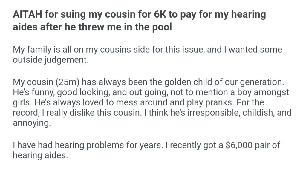 AITAH For Suing My Cousin’s For 6k For My Hearing Aides He Threw In The Pool