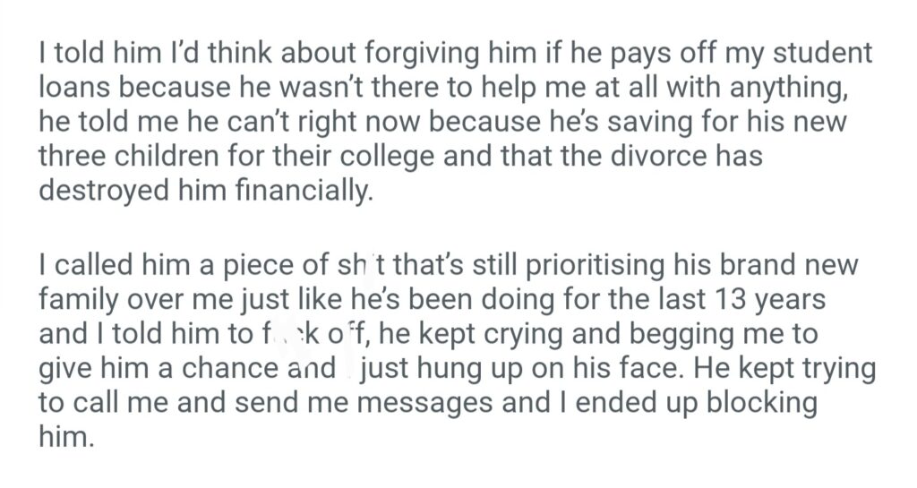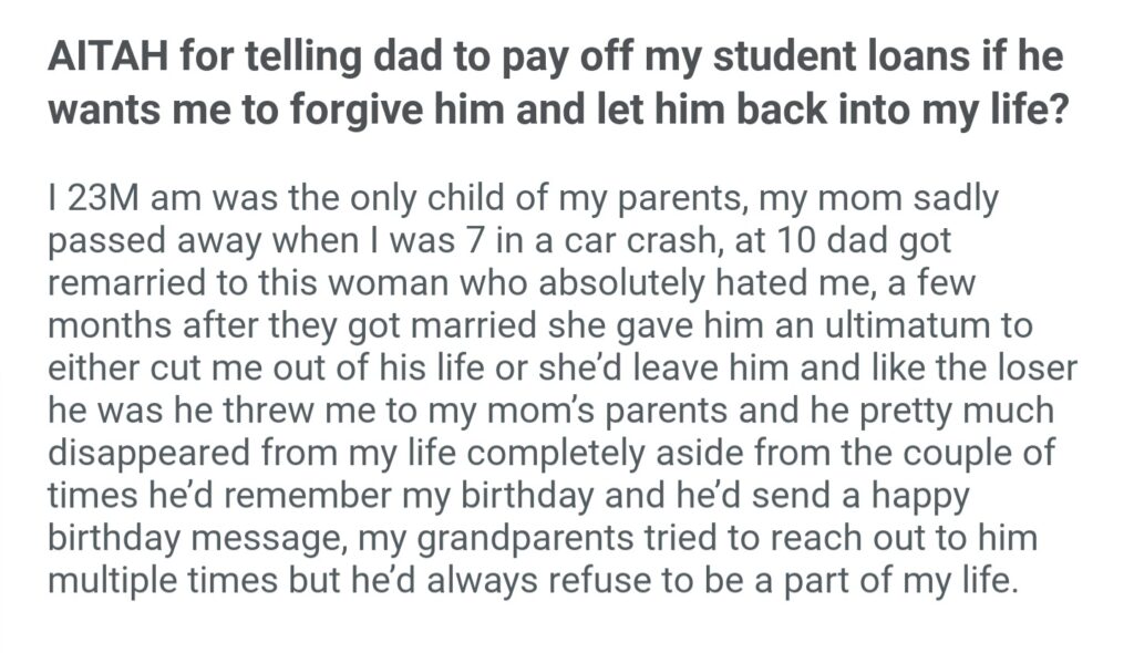 AITAH For Telling Dad To Pay Off My Student Loans If He Wants Me To Forgive Him And Let Him Back Into My Life