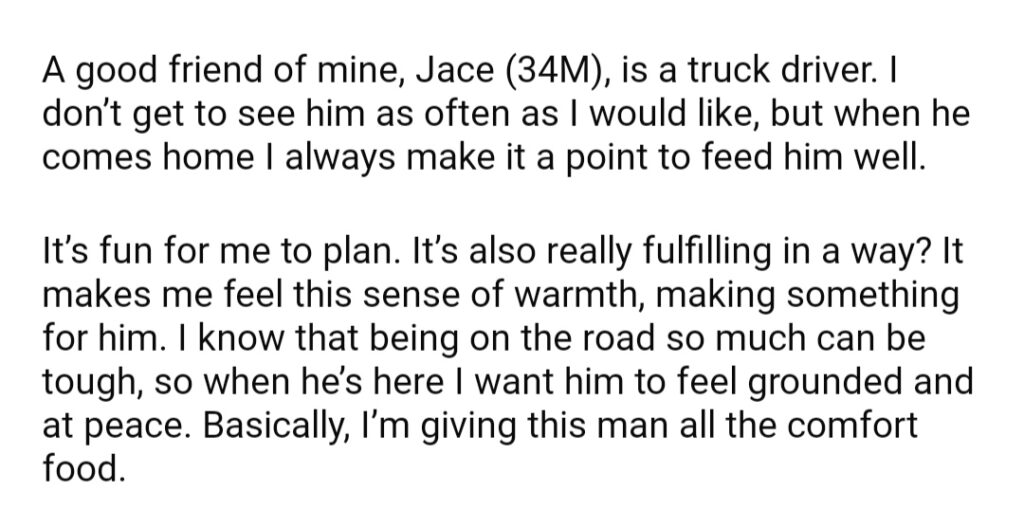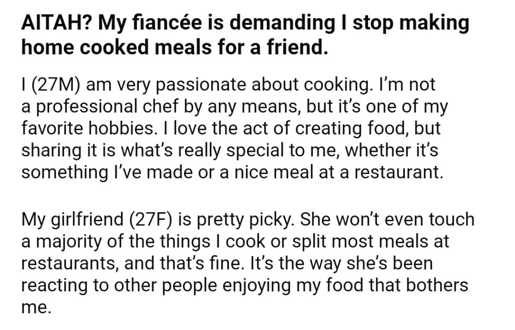 AITAH My Fiance Is Demanding I Stop Making Home Cooked Meals For A Friend