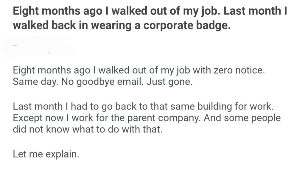 Eight Months Ago I Walked Of My Job Last Month I Walked Back In Wearing A Corporate Badge