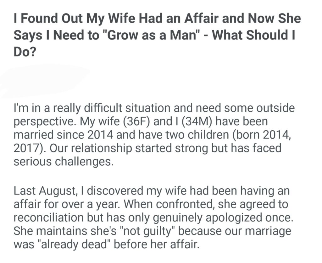 I Found Out My Wife Had An Affair And Now She Says I Need To Grow