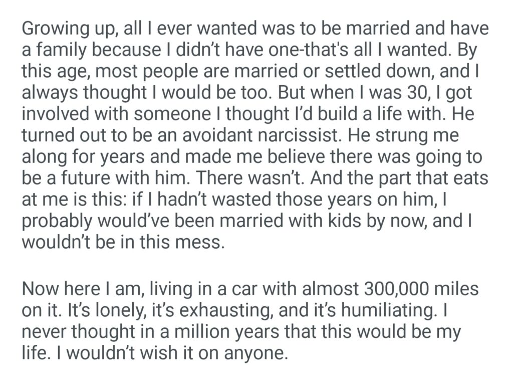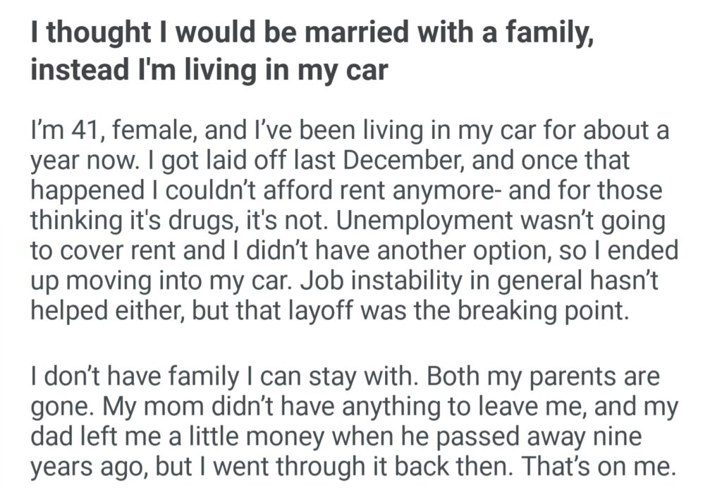 I thought I Would Be Married With A Family Instead I’m Living In My Car