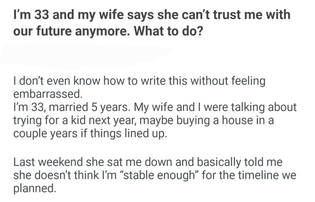 I’m 33 And Wife Says She Can’t Trust Me With Our Future Anymore