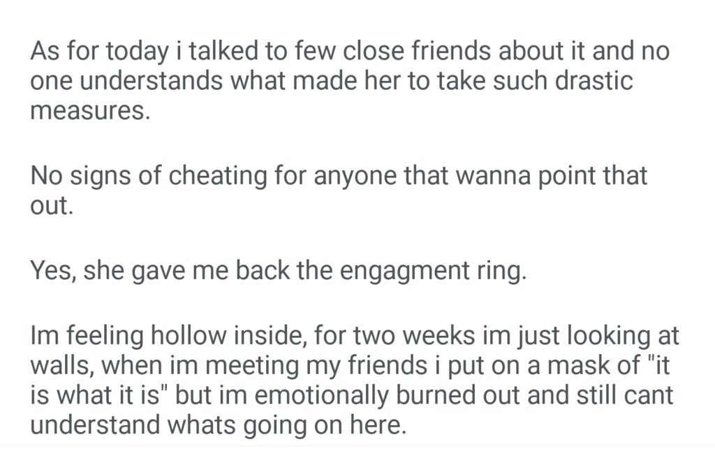 My Fiance Just Broke The Engagment And Nobody Understand Why Even Me