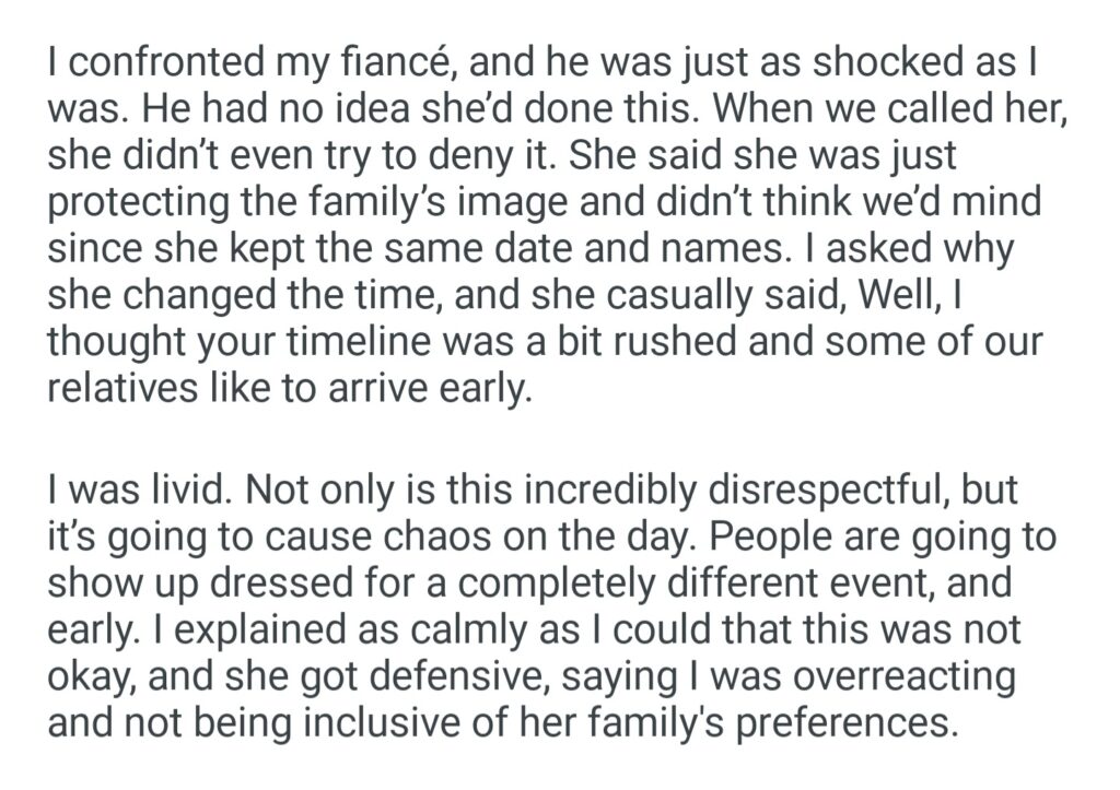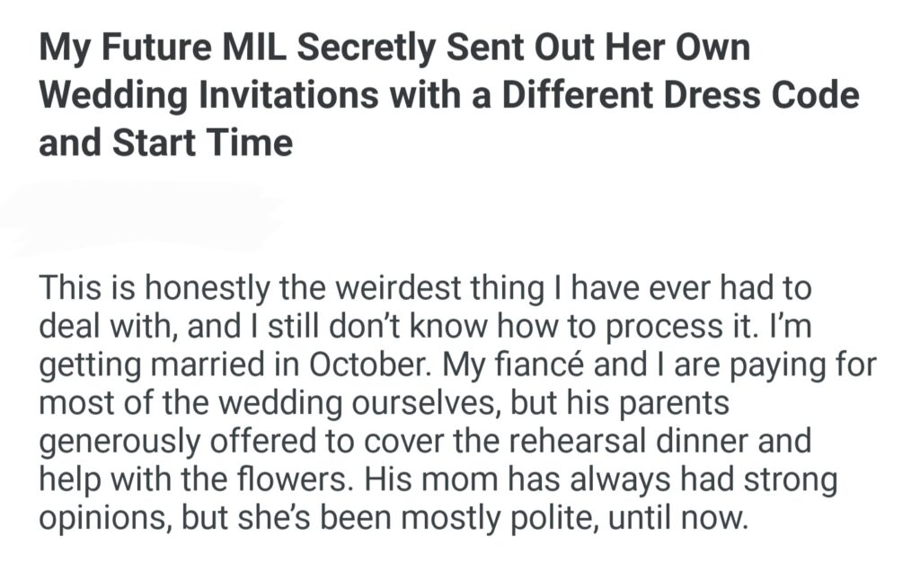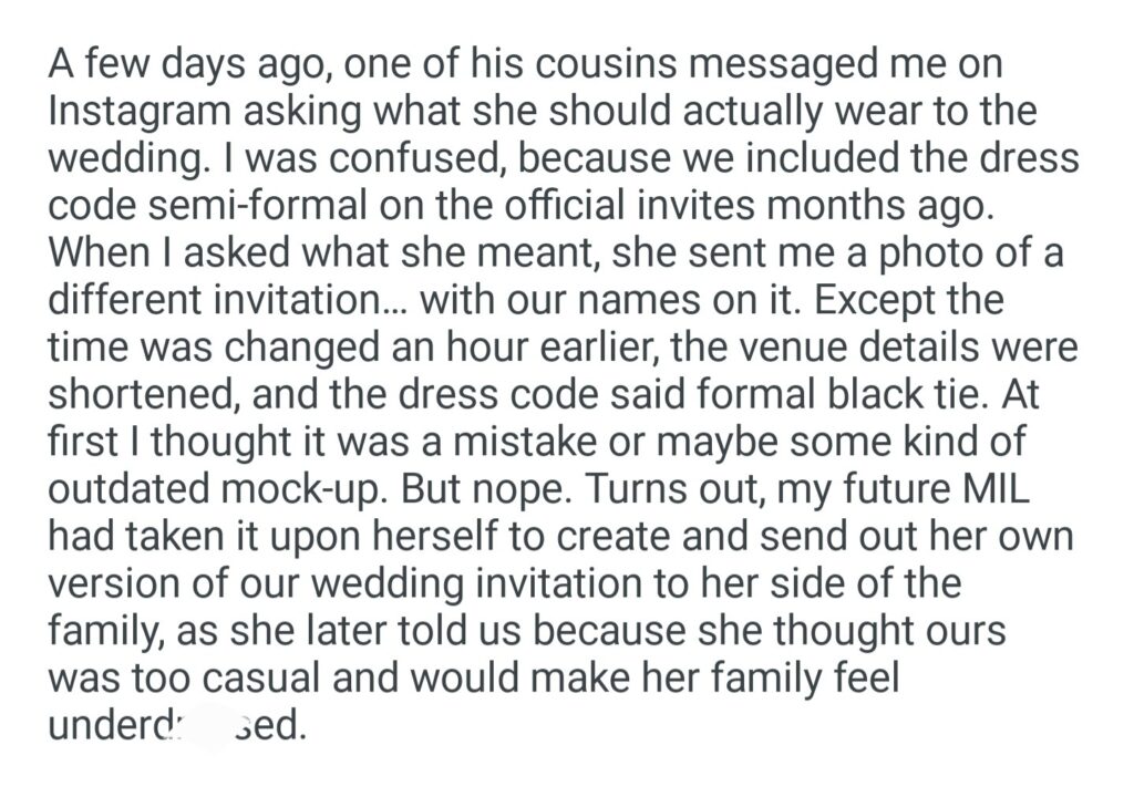 My Future MIL Secretly Sent Out Her Own Wedding Invitations With a Different Dress Code And Start Time