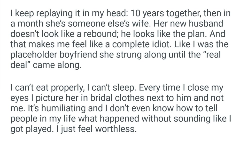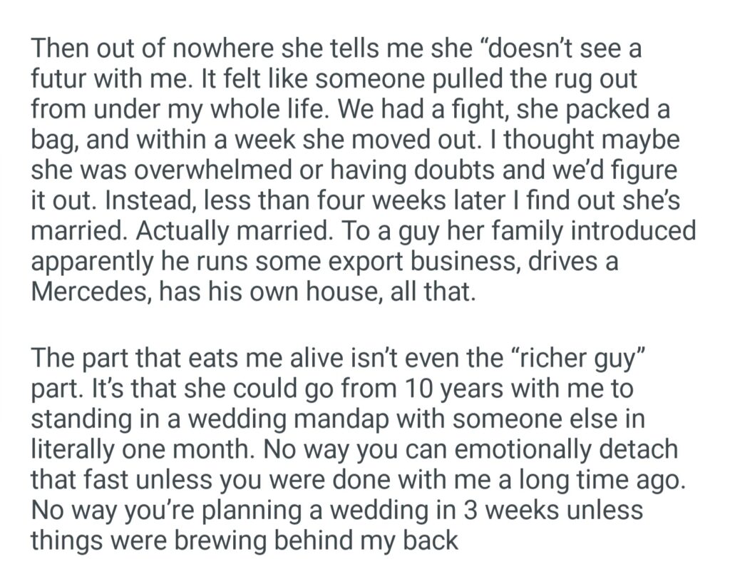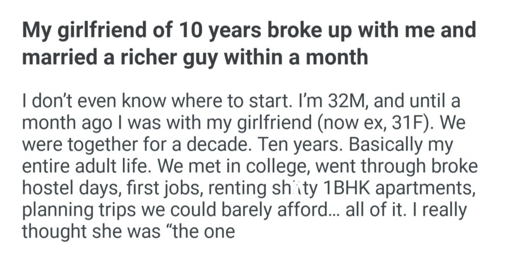 My Girlfriend Of 10 Years With Me And Married A Richer Guy Within A Month