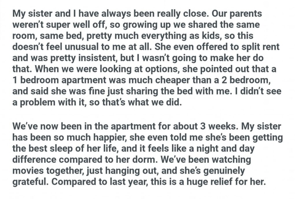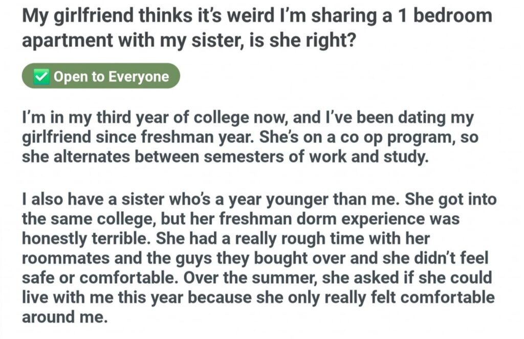 My Girlfriend Thinks It’s Weird I’m Sharing a 1 Bedroom Apartment With Sister
