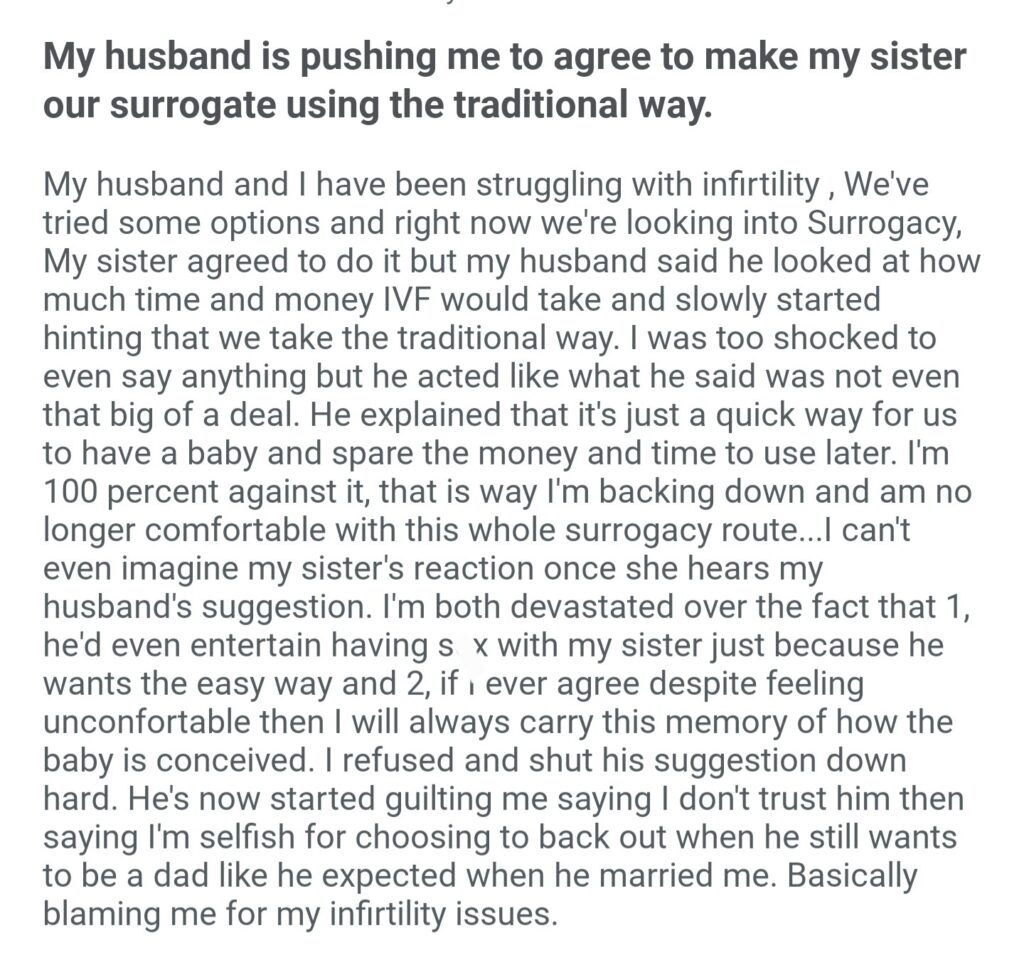 My Husband Is Pushing Me To Agree To Make My sister Our Surrogate Using Traditional Way