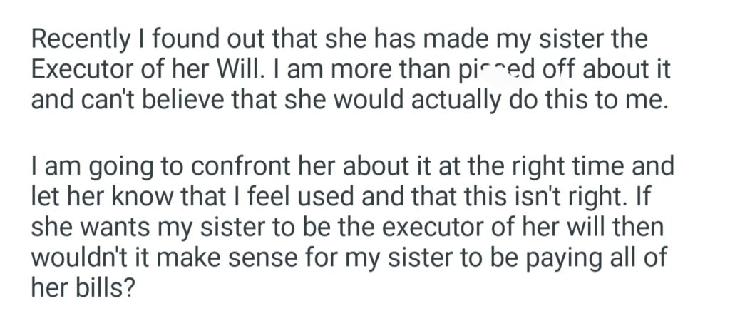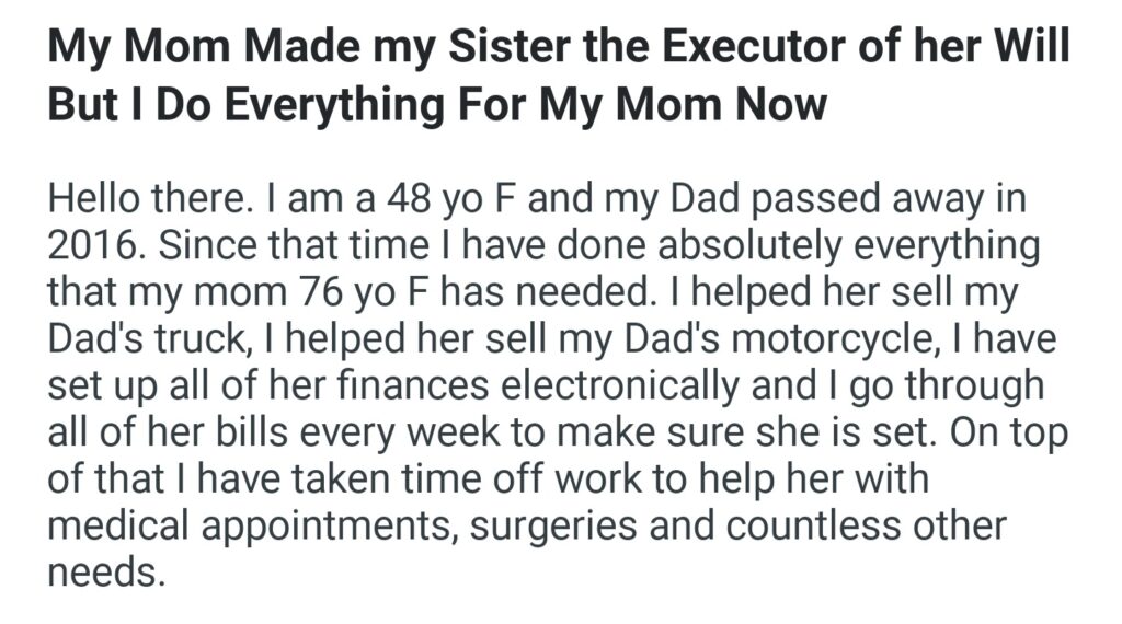 My Mom Made My Sister The Executor Of Her Will But I Do Everything For My Mother