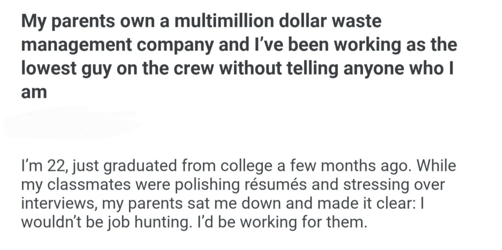 My Parents Own A Multimillion Dollar Waste Management Company And I’ve Been Working As The Lowest Guy On The Crew