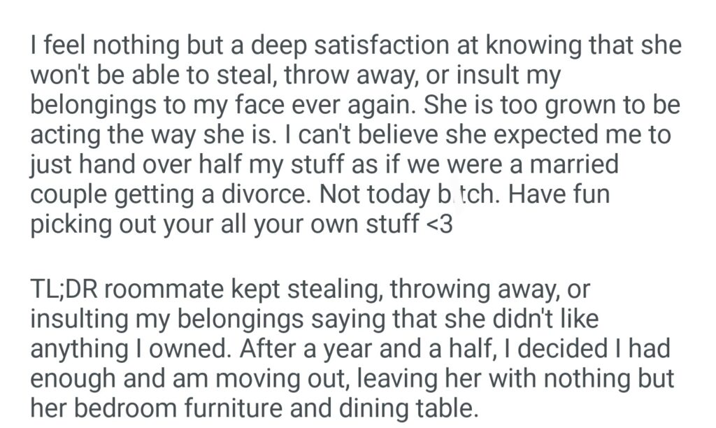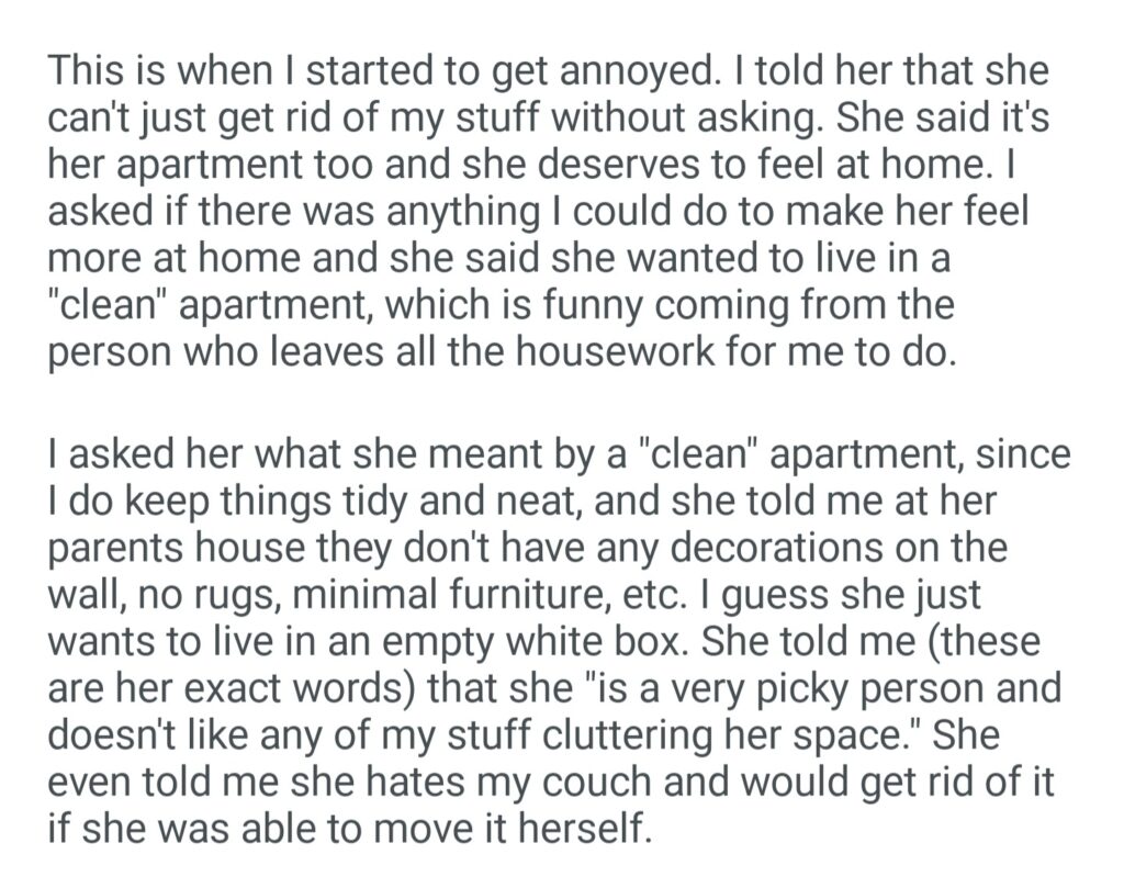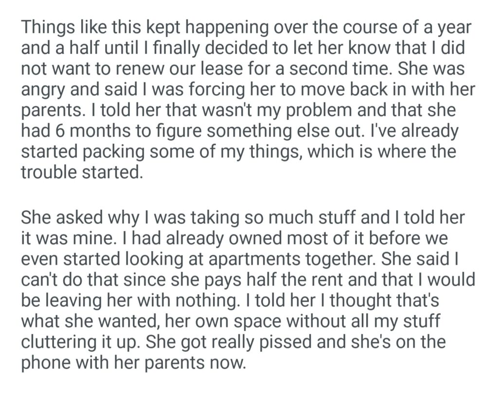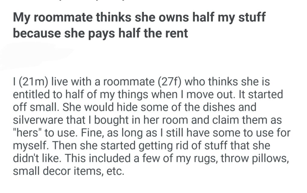 My Rommate Thinks She Owns Half My Stuff Because She Pays Half The Rent