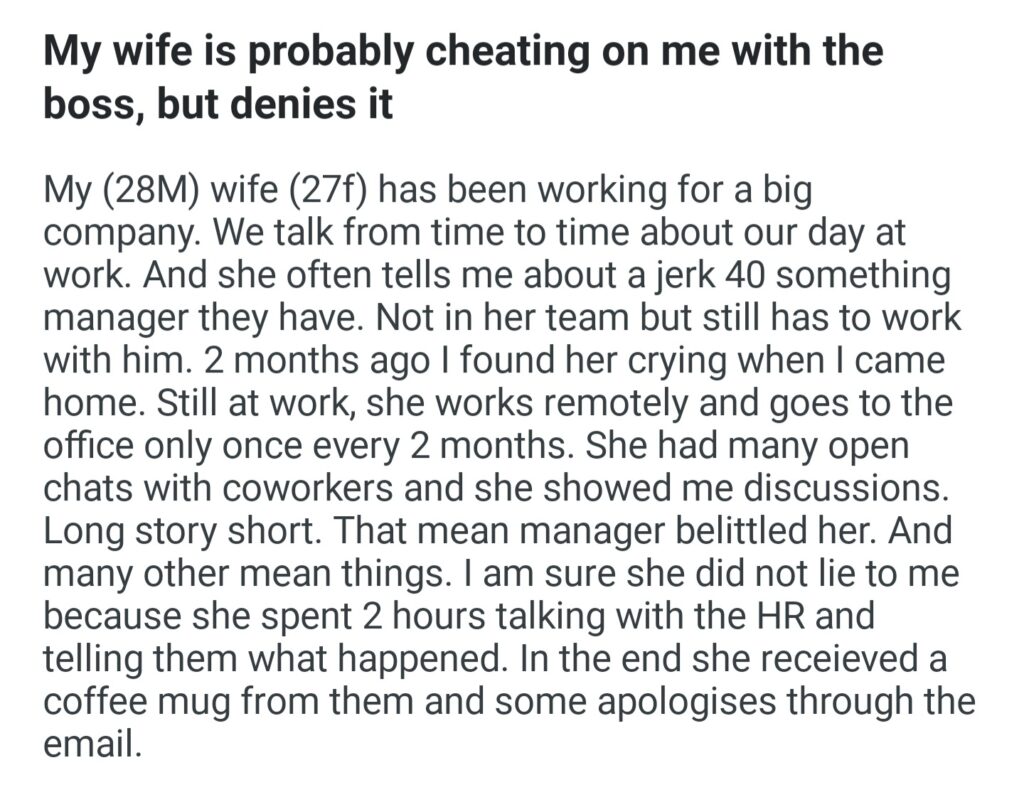 My Wife Is Probably Cheating On Me With The Boss But Denies
