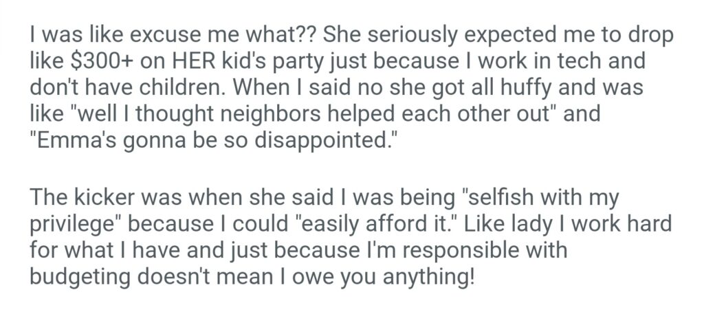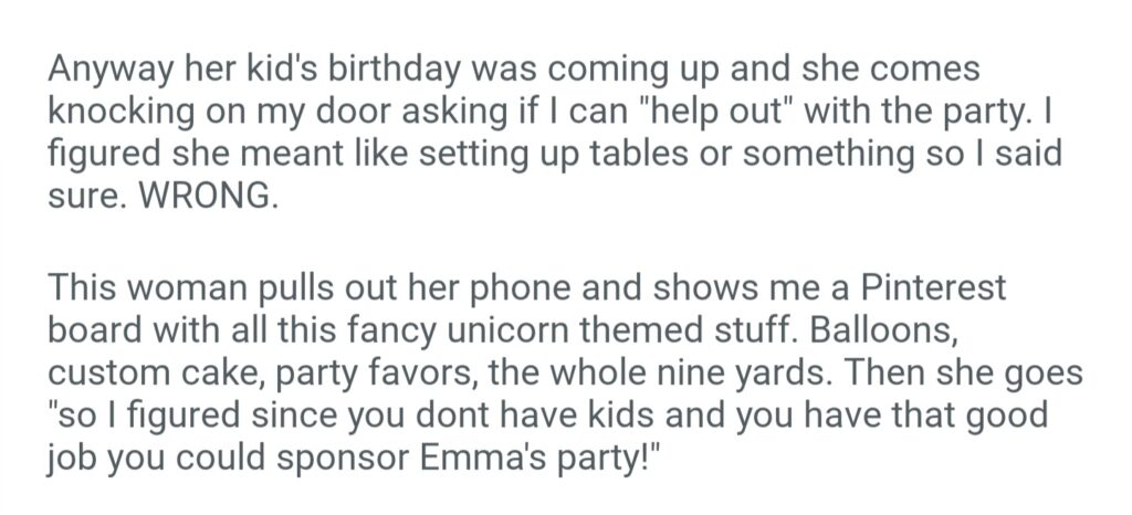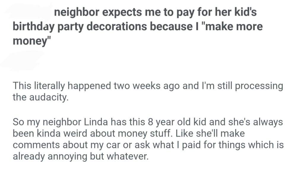 Neighbor Expects Me To Pay For Her Kid’s Birthday Party Decorations Because I Make More Money