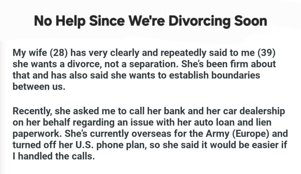 No Help Since We’re Divorcing Soon