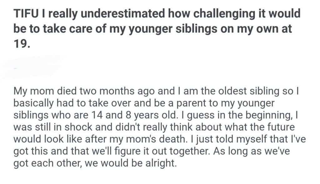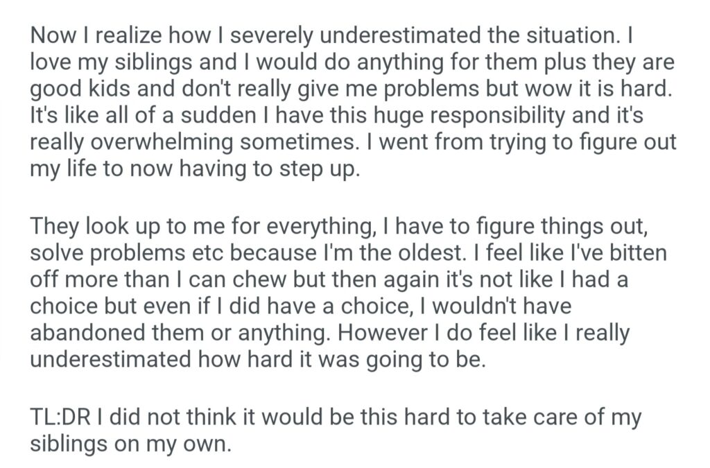 TIFU I Really Underestimated How Challeging It Would To To Take Care Of Younger Siblings On My Own At 19