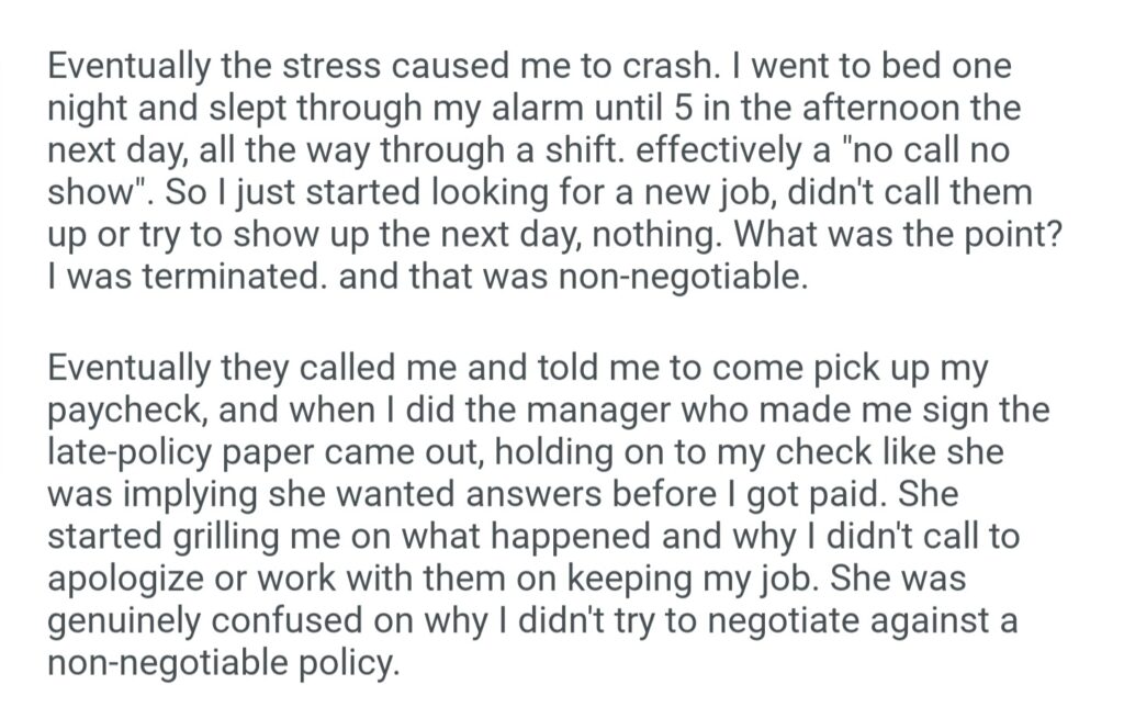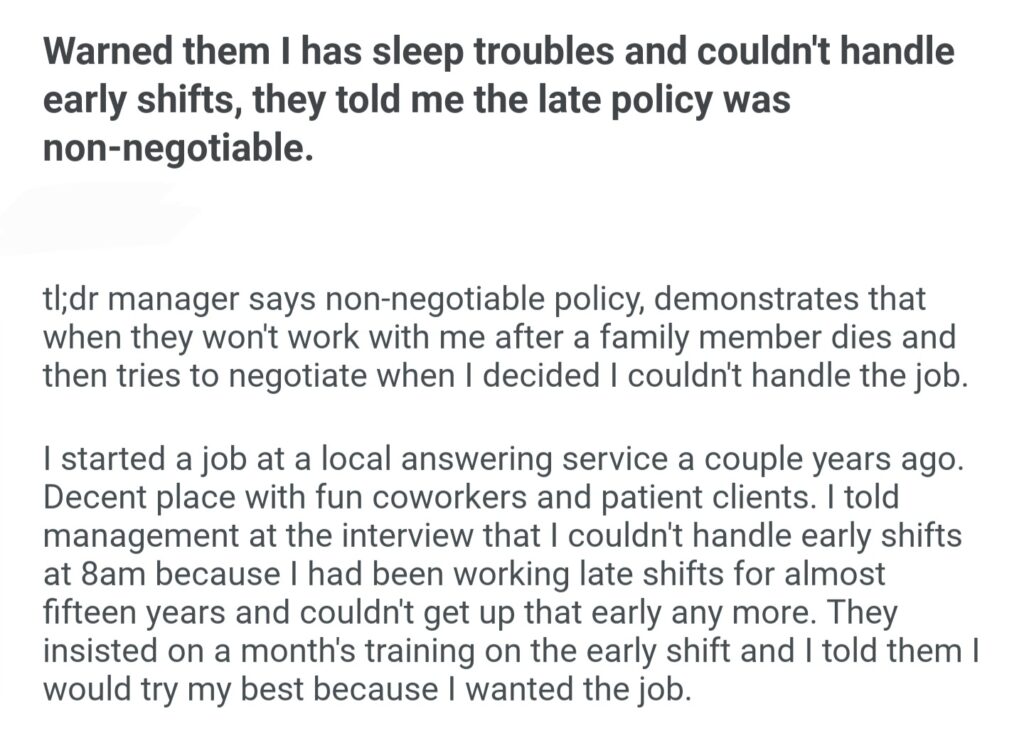 Warned Them I Has Sleep Troubles And Couldn’t Handle Early Shifts They Told Me The Late Policy Was Non Negotiable